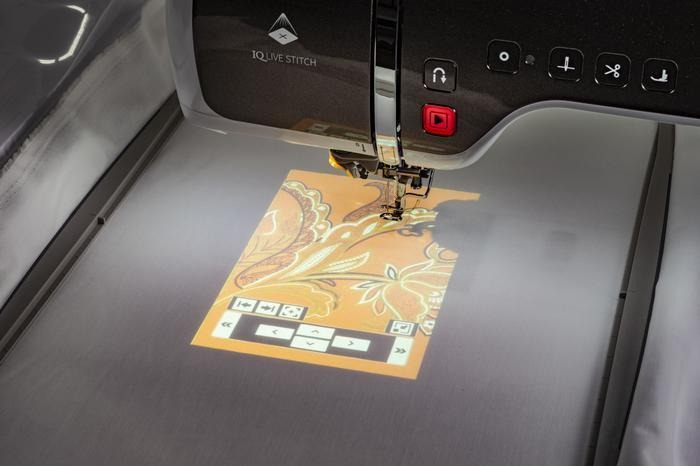StitchVision Technology: Projects stitch patterns onto fabric for precise placement and editing in real-time.