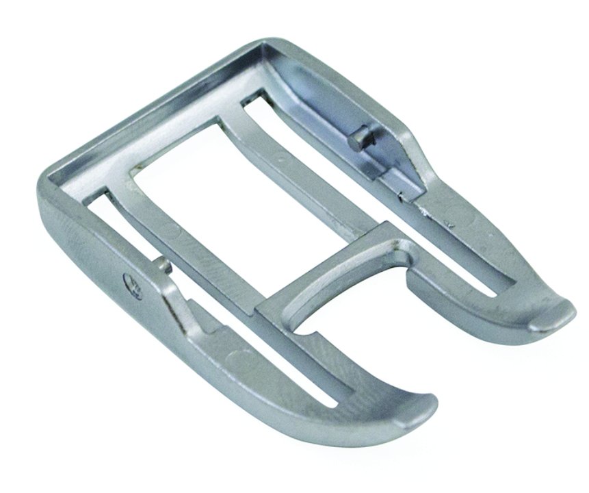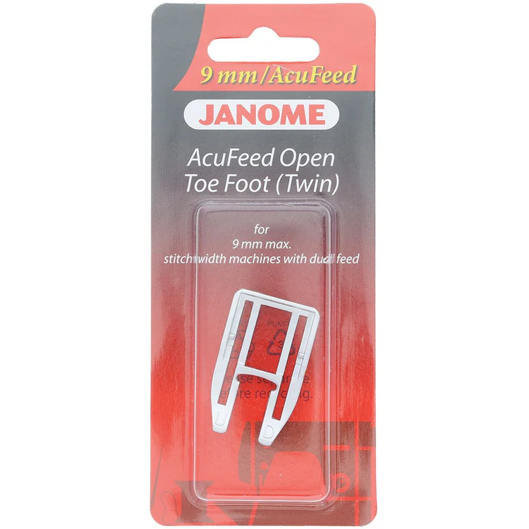 The open toe sole fits onto the Janome Acufeed twin holder to provide enhanced needle visibility. This sole is perfectly suited for applique and decorative purposes.
