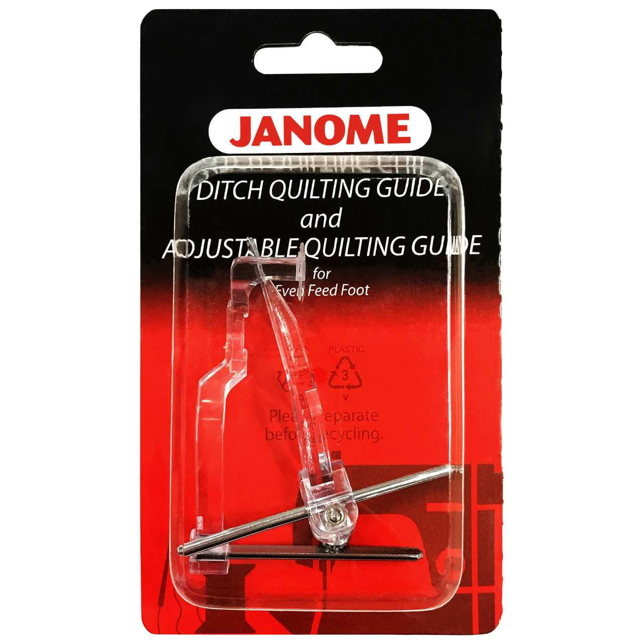 The Janome Quilting Guide and Adjustable Quilting Guide set allow you to stitch in the ditch or follow quilt lines with your walking foot.