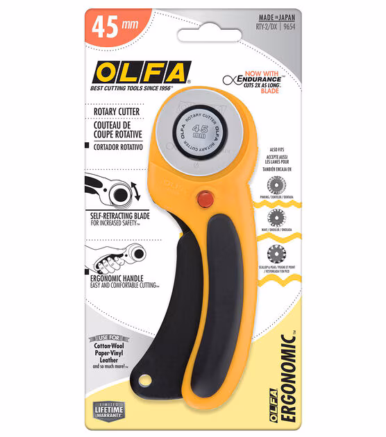 The best rotary cutter with improved ergonomics, safe, self-retracting blade, and clean sharp cuts. Perfect for a variety of fabric cutting applications.