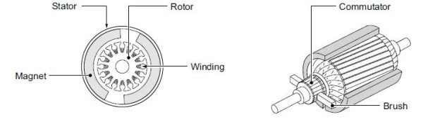 When an electric current is applied to the brushes, it flows through the commutator, creating a magnetic field that interacts with the stator (the stationary part of the motor), causing the rotor to rotate.